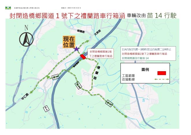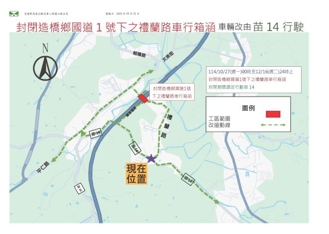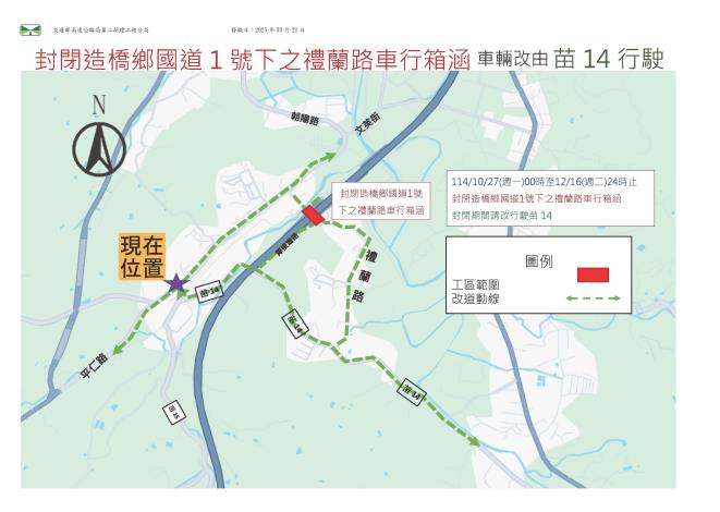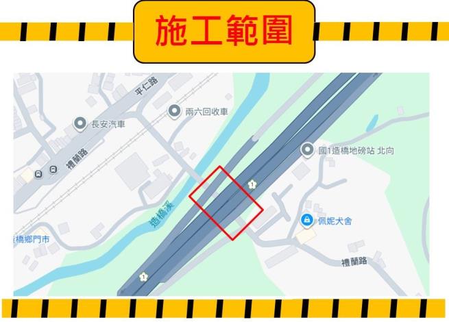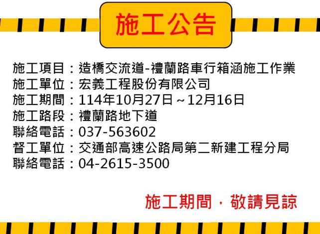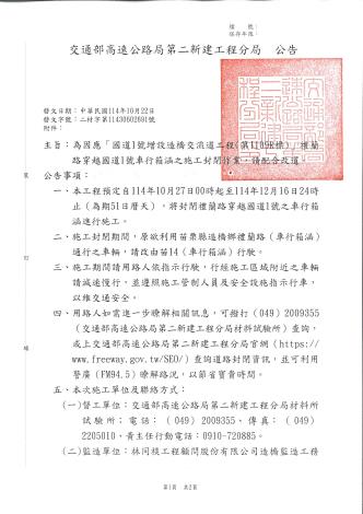 交通部高速公路局第二新建工程分局為因應【國道1號增設造橋交流道工程(第I109R標)】施工,將於114年10月27日(星期一)00時起至114年12月16日(星期二)24時止封閉施工,敬請鄉親提前改道,施工期間造成不便,敬請見諒。